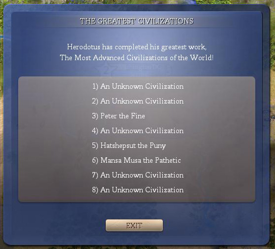 Herodotus completed his work but failed to list us among the most advanced of nations. I've given permission to both Cletus in the south and the Band in the east to "educate" him if they find him. I think he is a member of that unknown civilization that was at the top of the list.