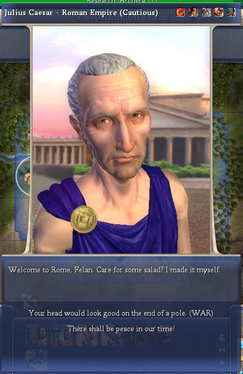 1875 BC - Caesar's scouts approached the capital from the southwest and offers us some salad, we offer them bacon and thankfully the salad was quickly forgotten and we all agreed that peace was the only sensible choice.
