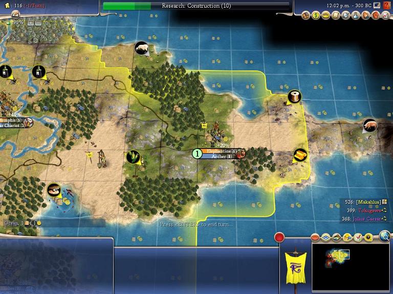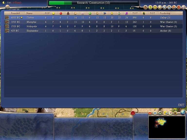 Memphis and Elphantine grow. Thebes starts working where the new farm is going, and Eleph is working a forest until the gold mine is done.