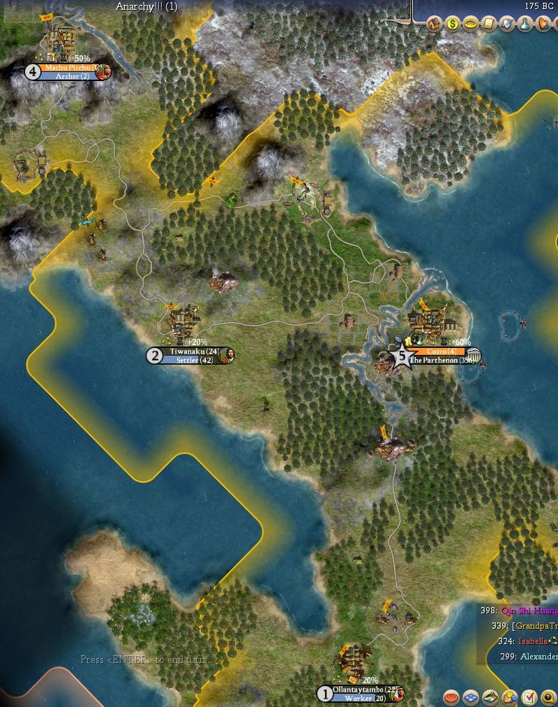 Any how, the city is nicely located between the marble AND iron deposit resource. City starts building a worker (15 turns).