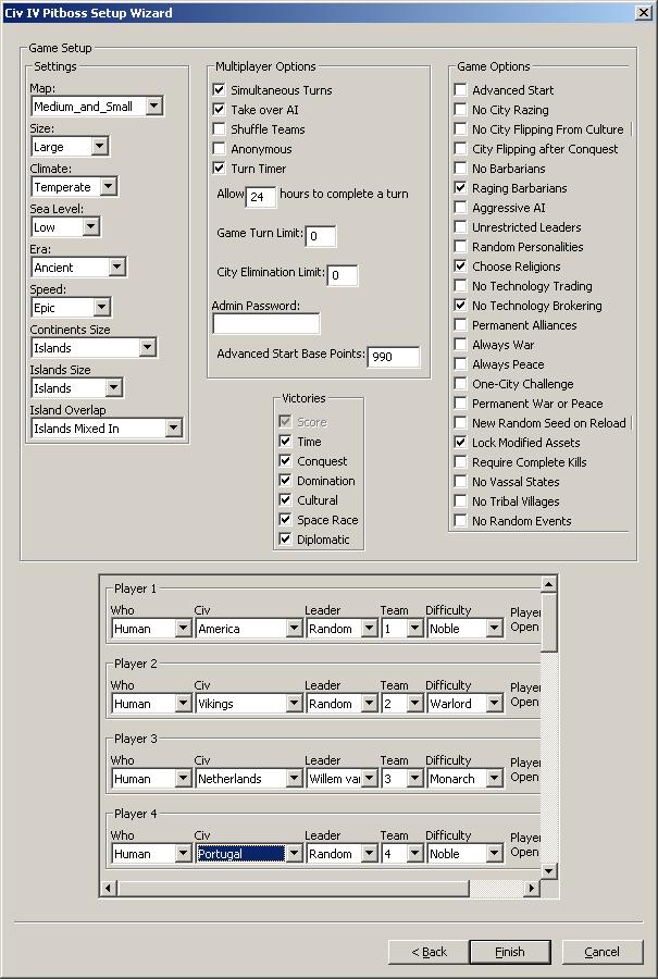 you two stick to what you were before (noble?) and bump me up by two (monarch). that way happiness and health will be killing me initially and negatively thinking AIs. but i'd like the dutch/netherlands again (you can both take them too if you wish). maybe you can put krazy down a level (warlord)?