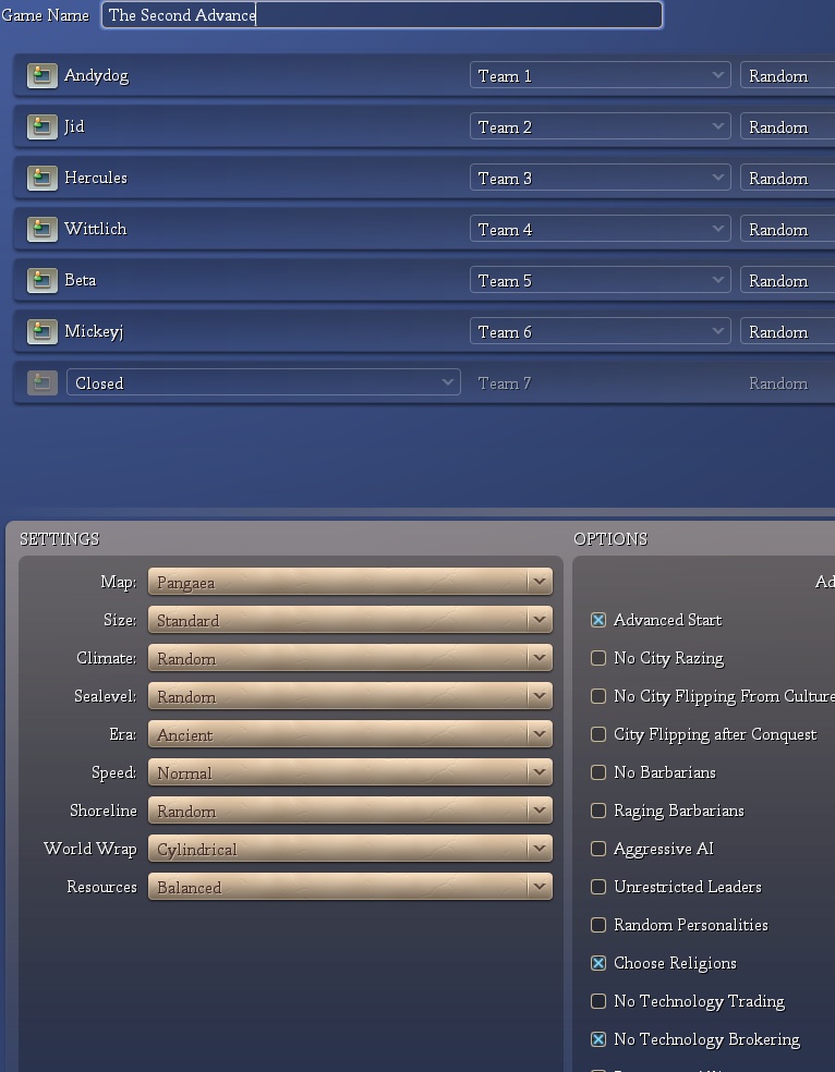 Standard sized pangea, balanced resources, no tech brokering, 600 advance start points.