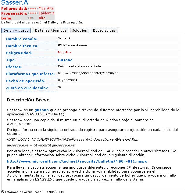 Parece que hoy día 1 de Mayo se activa un nuevo virus que hace lo mismo que el famoso blaster, te reinicia el ordenador en 45 segundos. Simplemente por tener la conexión de internet activa. Voy a pegar unas imagenes sobre el tema y una dirección de información.