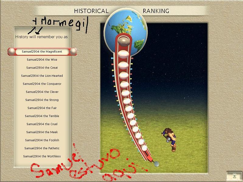 La verdad q no m lo esperaba y me ha sentado como ... en fin, mi orgullo esta herido. Se q he cometido muxos errores (principalmente q mi tactica fue de expansion y no tan militarista como debio de haber sido) y q Samuel en el fondo es un tio q se le puede ganar facilmente