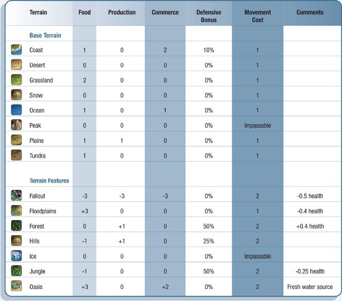 El mapa de Civ IV se compone de casillas igual que un tablero de ajedrez, pero en vez de casillas blancas y negras, tenemos diferentes tipos de casillas que representan diferentes tipos de terreno asociados a los que existen en la naturaleza.