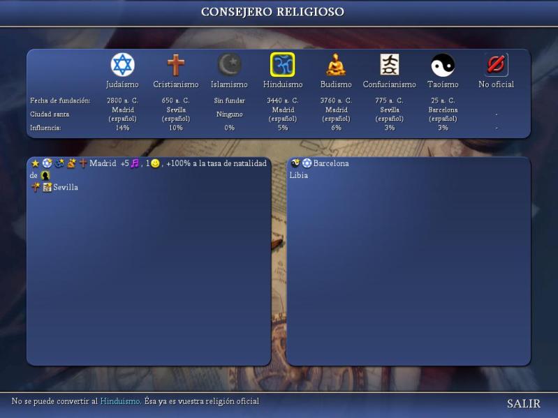 Alguien, me recomendo tratar de fundar todas las religiones, puesto que me forraría de guita. Sin querer, he empezado una partida al azar, tuve suerte y funde el Budismo, el Hinduismo y el Judaismo. Entonces pense que sería divertido el fundarlas todas, y he seguido esta partida. Aca algunas pics de lo que llevo en la partida. Espero sus comentarios.
