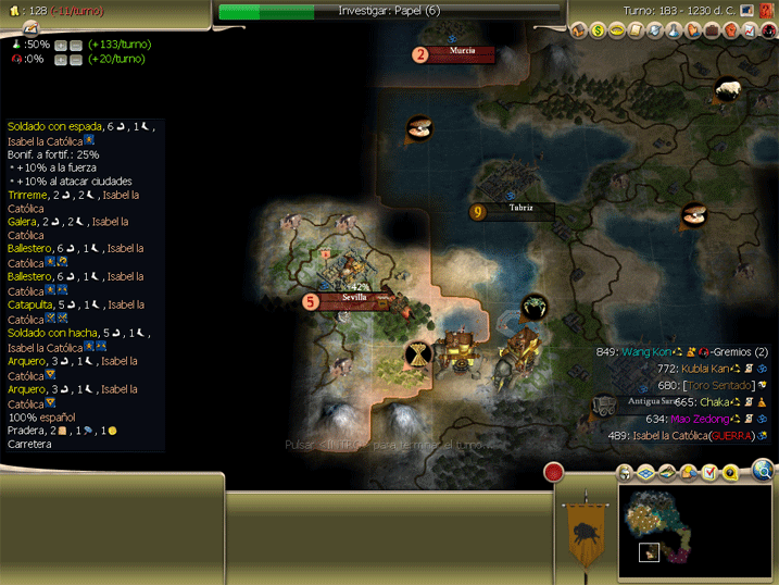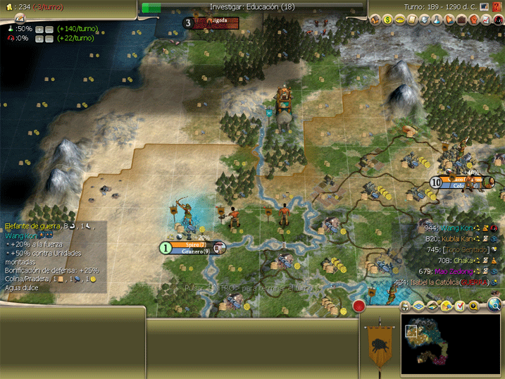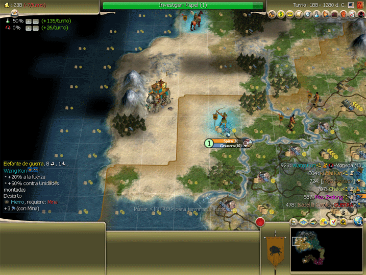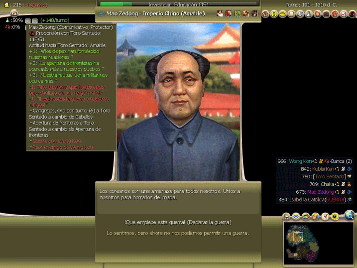 Justo en ese turno Mao nos pide ayuda militar pero se la negamos asustados por el potencial bélico de Wang Kon, ¿pero no ven que los indios siguen el pacifismo?, que se dejen de historias hombre