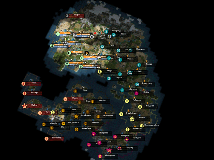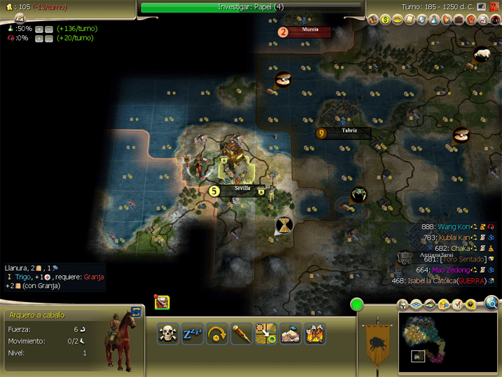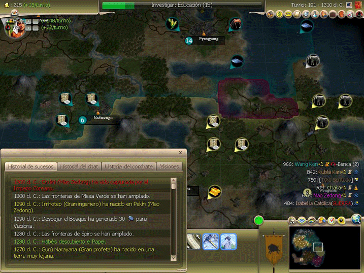 Se pone la educación en 18 turnos y se cambian los mapas con nuestras 3 naciones aliadas, lo que nos revela cosas que intuiamos, como 4 imperios que reparten un ridículo terreno. Viendo esto la salida del imperio indio se puede considerar como afortunada, parca en recursos, pero afortunada al fin y al cabo, todavía hay mucho margen de mejora.