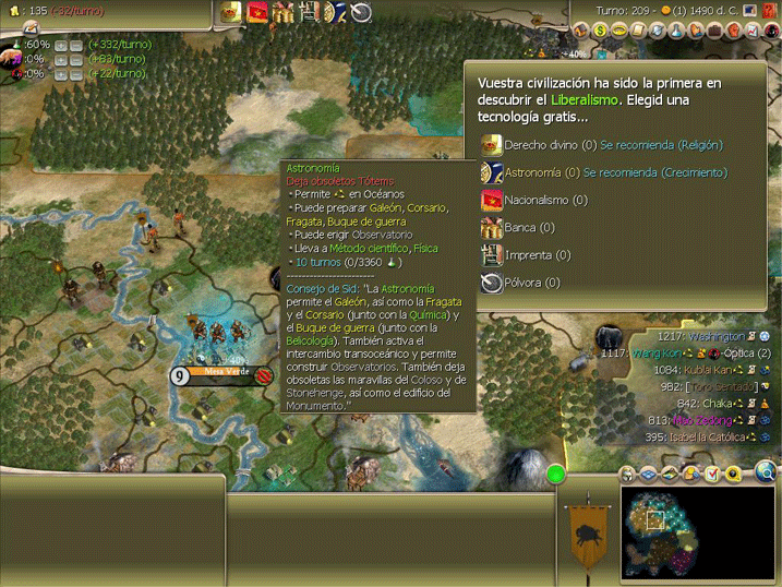 Se le cambia al mongol un montón de techs sólo para conseguir la óptica, que nos permitirá luego elegir la astronomía, la tech más cara que puedo coger.