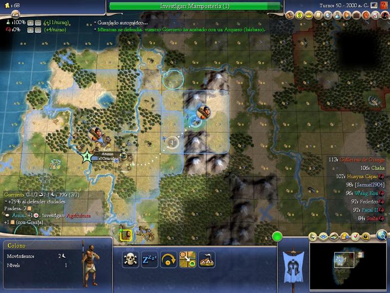 Nuestro settler se encuentra en camino a fundar la ciudad en donde se encuentra el arroz. Sin embargo nuestra vanguardia observa que un contingente de arqueros guerreros no nos ven con buenos ojos, por lo que dirigiremos a nuestros pobladores a 1 del guerrero y a ese mismo tile movemos a nuestra guardia.