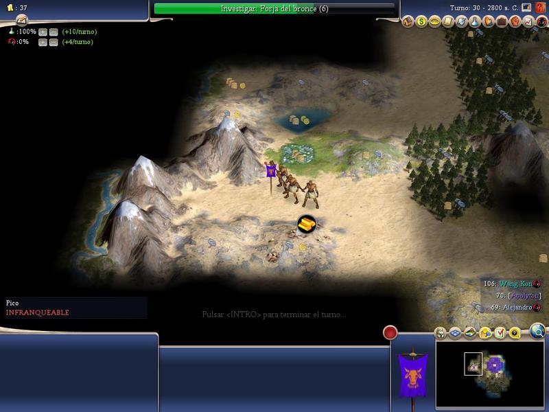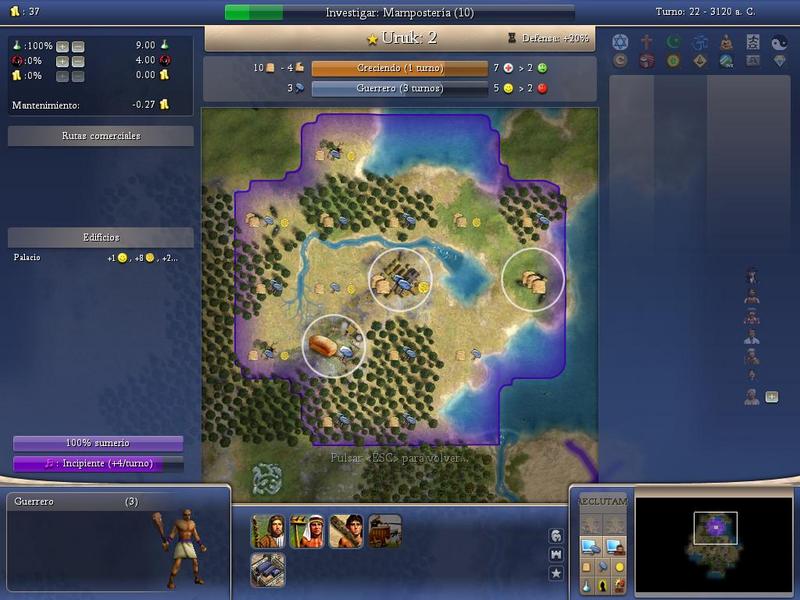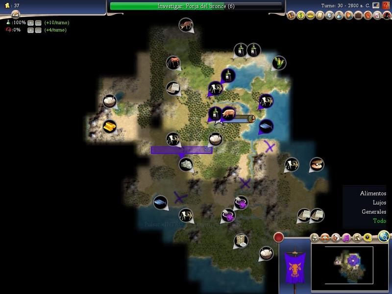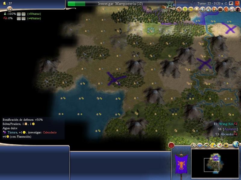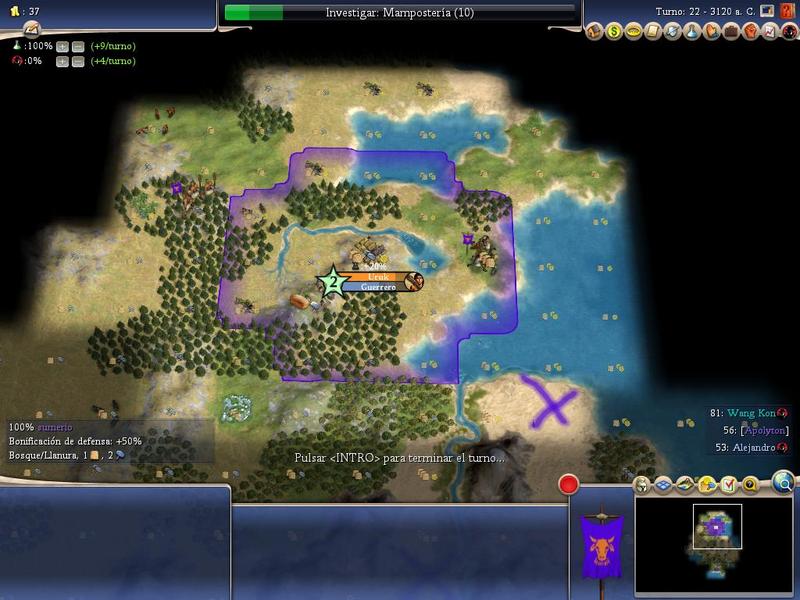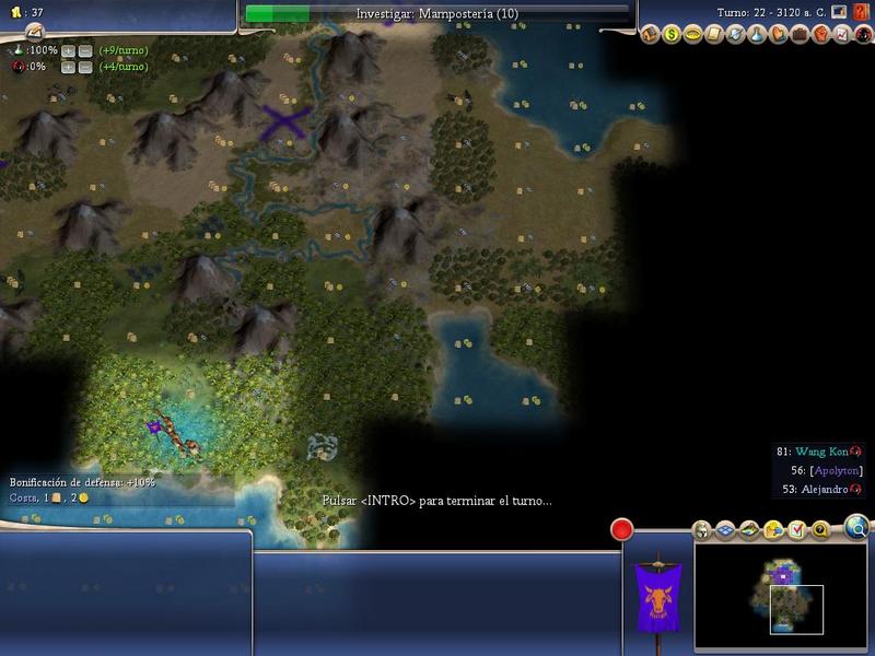 El guerrero del sureste ha descubierto que la zona selvática al sur da con el mar. El mapa de momento me recuerda a los continentes alargados, o quizás a una Pangea achatada. Podemos cerrarles el paso de expansión a nuestros vecinos y reservarnos un pedazo de terrotorio, por lo menos por el este, por el oeste el guerrero recién construído servirá para explorar esa zona.