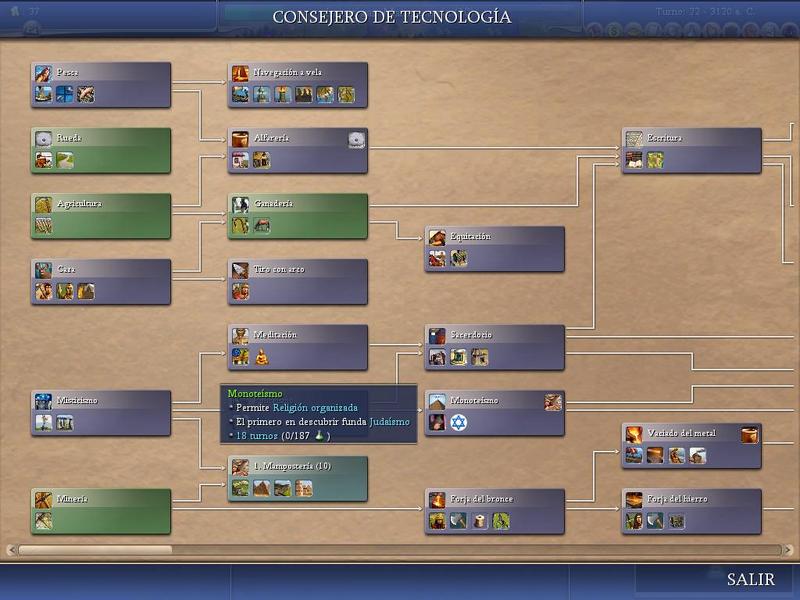 Jugados 10 turnos utilizando lo propuesto por Don Pablo (lo certifiqué antes y tenía razón, 1 turnos antes se obtiene al colono). Eligiendo minería como tecnología, así que he parado justo antes de la selección de la próxima tecnología.