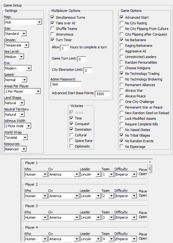 La configuración queda así (en la imagen pone era Modern, pero en español es Contemporánea). He quitado eventos, bárbaros y huts. Se admite poner a un jugador en IA y se admiten los estados vasallos.