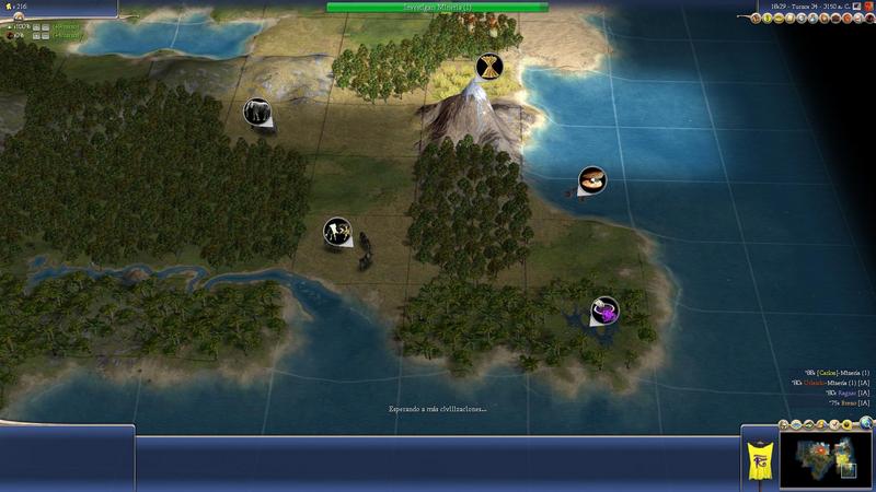 Os pongo el mapa que está explorando mi guerrero en la última partida que he empezado con un amigo. Si os fijáis, justo debajo del pico, de la montaña, se puede fundar una ciudad que recoja 5 recursos, o pueden hacerse dos, una con los elefantes y el trigo y la otra con el resto.