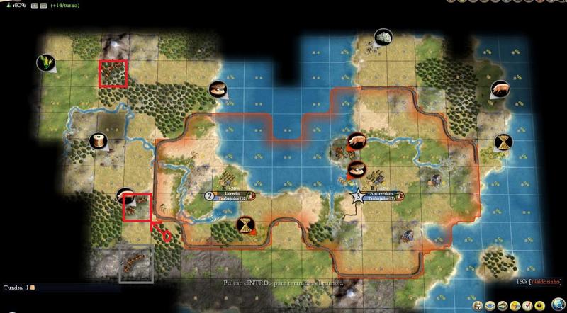 - El trabajador que he hecho el pastizal no tiene movimiento, pero el que acaba de salir de Amsterdam lo muevo al bosque, único que me queda cerca de las dos ciudades, para talar. Se decide esto porque no encontré manera de que arquero y crecimento de la ciudad se coordinaran en 4 turnos y puediera poner un colono. Asi que con la tala que tardará 4 turnos exactos se podrá acelerar el arquero en 4 turnos y dar un empujón al colono.