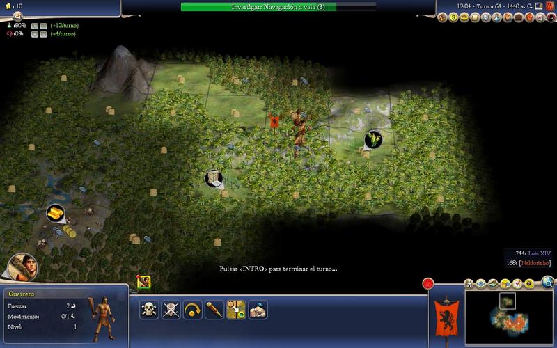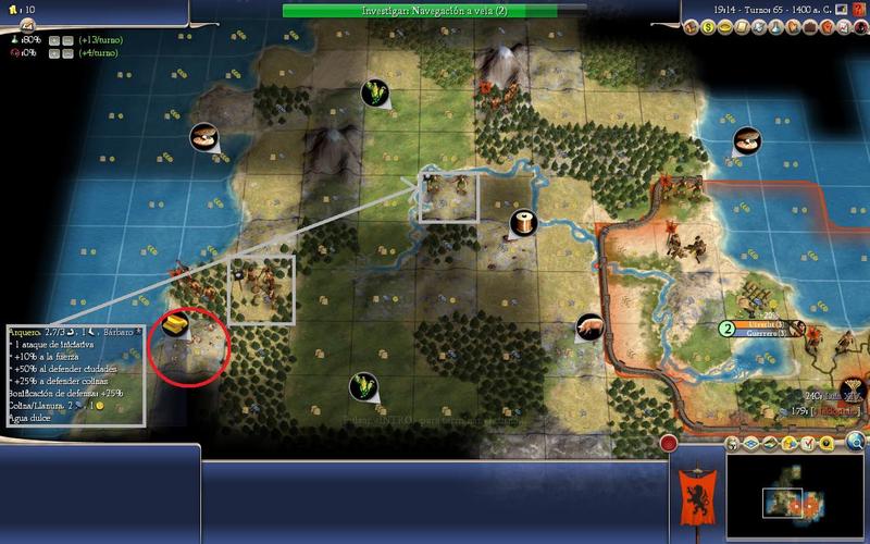 - Hay un arquero bárbaro por el centro y otro guerrero defendiendo un hut. Veremos si el primero puede atacarme al arquero en una colina con bosque y que gane experiencia.