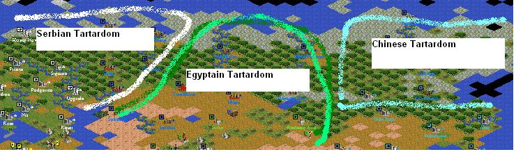 "With the Tartar nation leaderless and out of control, in virtual anarchy, it is the policy of the Azande that China, Egypt, India and Serbia may destroy this nation and divide it amongst themselves. If agreed a proposal map is required for International posting. Under this 'arrangement' Azande view a maximum of 10 ofensive units per nation as adequate for the purpose. Tartar culture must be preserved and a memorial to the age old and legendary Winzity the Grate be built in the Tartar capital.""Old age and skill will overcome youth and treachery. "