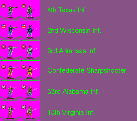 Here's another compilation of minor Civil War units that I had intended for "Guns of the South". My idea was to try to have a special infantry and or militia unit for each and every state in both the Confederacy and the Union in gameplay. With ToT I'm certain I could have come close to that goal if not achieved it. Just out of curiosity, would anybody be interested in a game based on "Guns of the South"? Where time travelling Afrikaner's attempt to overthrow President Lee and take controll of the Confederacy to shape it into they're vision for a white supremisist state. All this at the same time when the US is waging a bloody invasion of Canada while Britain inflicts a crippling blockade of America's east coast.