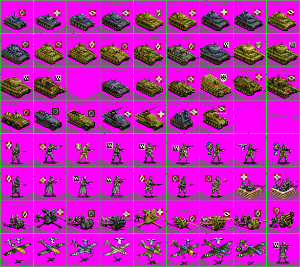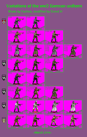 I've had an obsession lately trying to find out what was the "official" ww2 uniforms, and as I asumed there were several of them. It's almost an impossible job trying to dig up all the camo patterns of the SS as there are dozens. But these are humble attempts at the most common uniforms used, both Wehrmacht and SS. This was as close I could come with the MGE pixels.