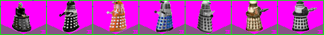 Thought Id post my Dalek units here as well.The one on the far left is Davros half humaniod half Dalek former leader and creator of the Daleks he was killed in the last great time war. Next to him is a commander Daleks and next to him are three other Dalek variations and to the right of them are two heavy weapon Daleks which only appeared in a few of the older episodes.