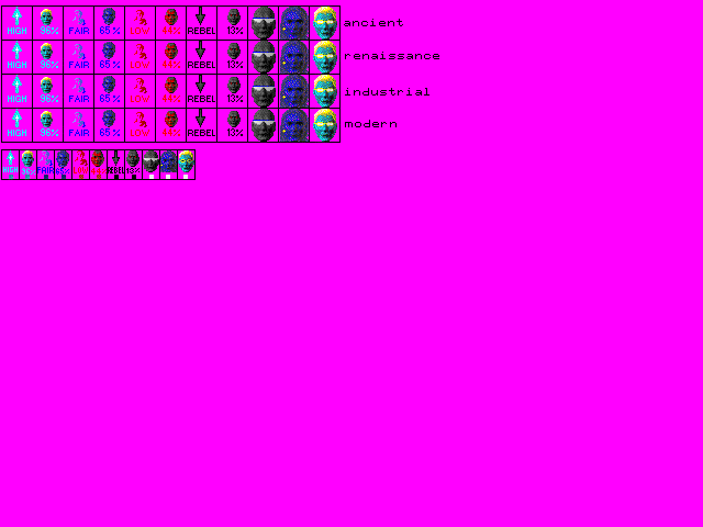 And heres a standard Civ 2 version of the people file I made for ToT. The faces are based on the drone dude from Alpha Centauri. Its meant to be a sort of opinion poll idea, without any change between eras.