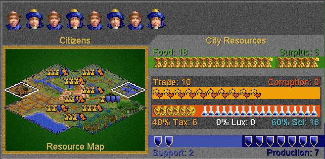 That is to say, terrain Tiles, Citizens and Capital investments are used to get food / shields and trade arrows which are used to get more citizens, more terrain tiles (by building new cities -settlers- or conquering -military units-), and more capital investments (buildings, terrain improvments), and the cycle goes on.