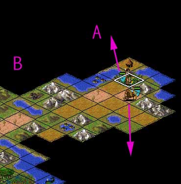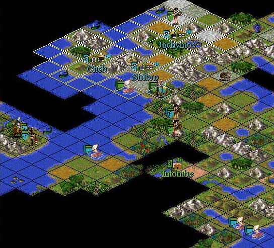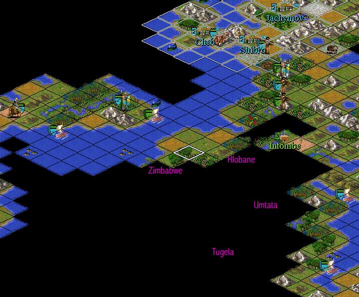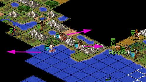 I found a strait in the eastern hut-hunting area. The Main ocean (#1) is coming from east and so not from north probably. So the two lands A and B are connected probably and I needn't send one unit to each of them. So the Chariot will go south, there should be at least one hut and P. might want to send units from Lonsim there.
