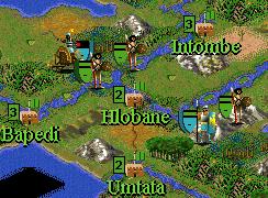 stacks, killing 3 warriors, a phalanx, and a horse. I was hoping he had only one wounded chariot there. His cat kills a warrior in Hlobane and an archer kills a warrior in Intombe. His dip steals currency from Intombe. He has a new stack near Zungu, which is undefended (I wonder why he didn't just take it?).