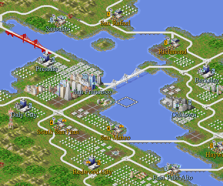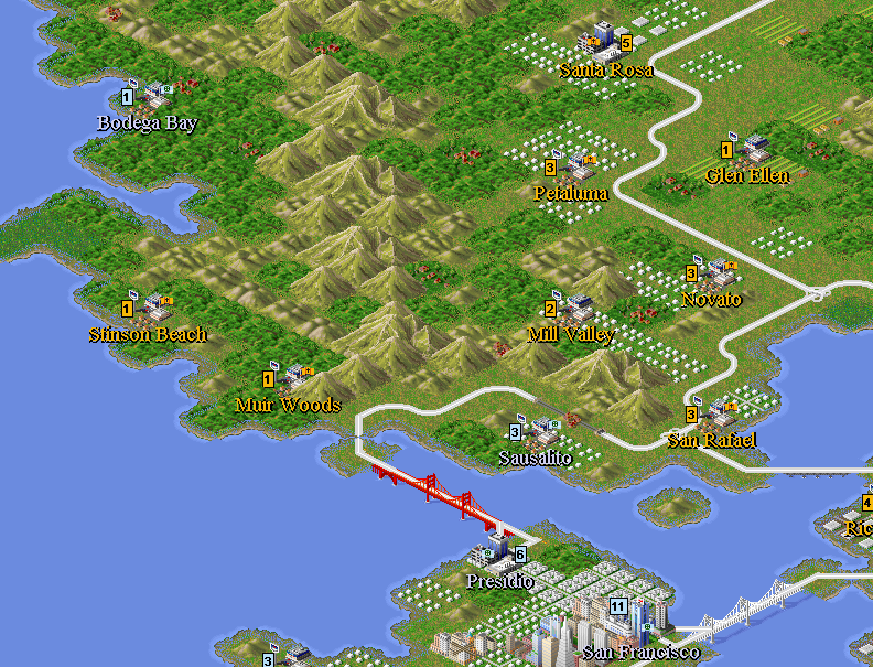 I'm systematically touring the Bay Area over the next month, with trips to Napa Valley and Santa Cruz this weekend. Most of the locations on the map are within a few hours on mass transit (though in the game, it'll take several months to drive from one end to the other )