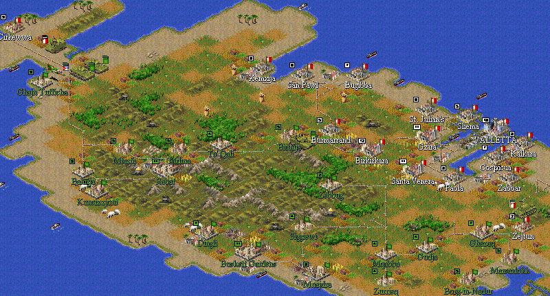 Once the front was stablized, I attacked across the northern hilly area with a strong armored force which included the Germans, linking up with my forces from the north island. Once Rabat was recaptured, Libyan resistance crumbled, and the remaining cities to the south fell in 4 or 5 turns.