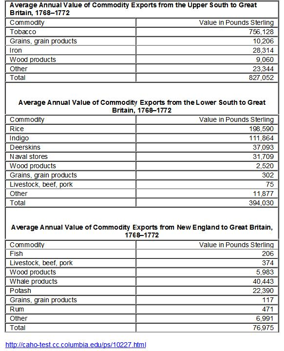 After checking out a number of sources on the Web, it became clear that New England, the central colonies and the southern ones produced and exported very different commodities. The table at the end of the post is as good a summary as I could find although it deals only with export to Britain.
