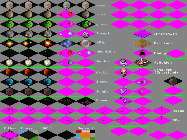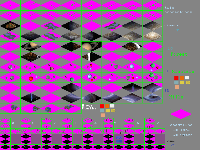 1. My sea tiles are corrupted. I'm using them as space tiles, so I have them as largely black with a few pixels here and there of other colors for a starfield. Same deal with the river mouth terrain squares. The only problem is that it seems like some of the squares are transparent and "hold" whatever color pixel previously occupied that square.