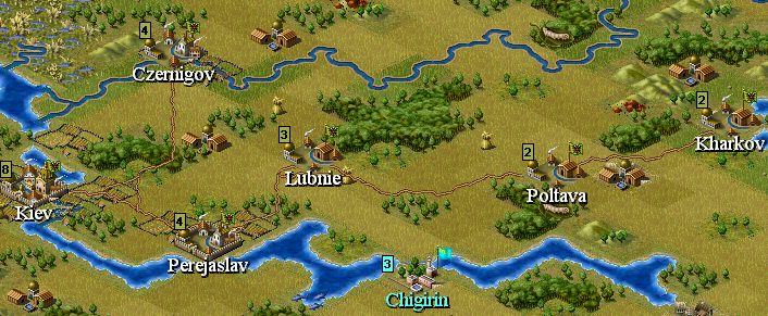 Nevertheless, I decided to to attack the bunches of forces and retreated my cavalry units (and some infantry) back to Lwow, and waited. When the Tukrs did mobilize, they managed to take the fortrees, seized Zhitomer, and fanned out across the countryside as they began to march, more or less, on Lwow: