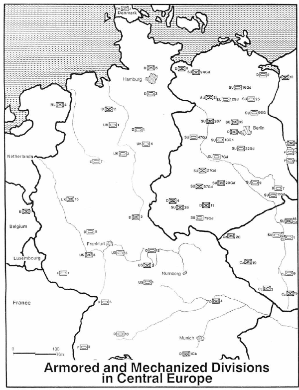 It's important to note that neither NATO or the Warsaw Pact expected a conventional war in Europe to last for more than a few days or weeks before it escalated into a nuclear war or ended in stalemate. Both sides knew that their opponent would probably go nuclear if a breakthrough took place (eg, if Warsaw Pact forces crossed into France or NATO came close to the Soviet border). As a result, the role of the conventional forces was to buy time for a negotiated settlement by ensuring that the war didn't go nuclear too soon. Not surprisingly, the conventional forces were actually pretty well matched - all the realistic war games I've played show the fighting ending in stalemate, with both sides suffering massive casualties. The unit density and quality of forces on both sides was such that there was little chance of a breakthrough taking place anywhere along the front lines.