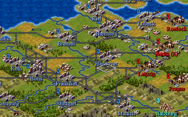 The Ostfront map I'm using is excellent for an SP (or MP) European campaign, but it seems to have been "stretched" to adjust for Civ 2's peculiar "diamond" grid pattern. This is probably good for gameplay, but it does make it harder to translate things (such as route routes, unit placements) from a normal map to a Civ 2 map. One example of this would be my attempt to duplicate the 1980s road/(rail?) network of Germany: