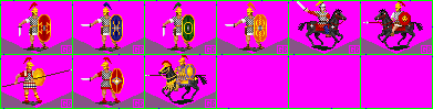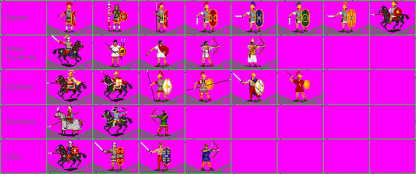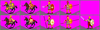 top row, Republican: hastatus, principes, triarius and velites (all Punic wars) and late Republic/Augustan legionary