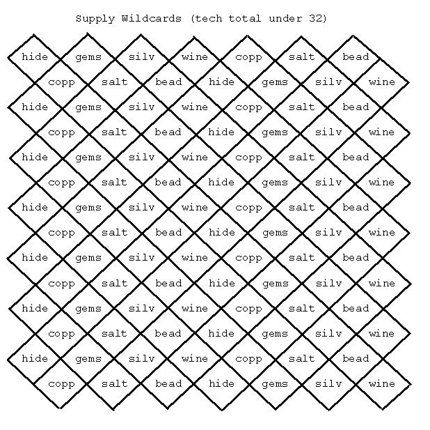 Using these charts, it was only necessary to calculate wildcards for just one tile in any area of the map being examined. Once one set of wildcards was determined, these charts could be used to find the relative positions of all surrounding wildcards. In fact, if some cities were already present, no calculations were necessary, since there would be enough wildcards among their middle commodities to verify the patterns seen in the charts.