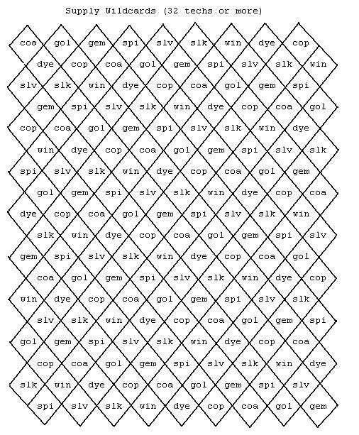 I thought I would add a small supplement here to my section in the guide about commodity wildcards. While playing EL games and when looking for colony locations having wildcards matching those of my SSC, I did not want to bother calculating the wildcards for every potential site. Instead, I used charts that I had made of the various wildcard patterns as they appear on the map grid.