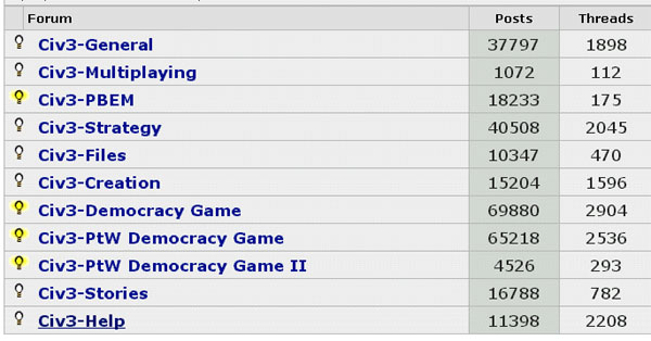 Now a lightbulb on a person means they're either logged in at the moment or not (which can also be hidden if I remember correctly). Which means at the time of my edit of this post (around 19:15 PDT), Theseus, vxma1, Chilean President, and Trip have all found better things to do on a Friday night besides looking and posting at Apolyton, but as for myself and GhengisFarb, well, what can we say...Last edited by badams52; July 25, 2003, 22:09.badams