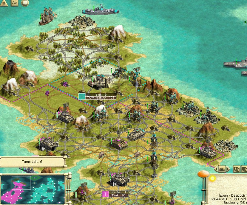 [*]Related to this is how the AI landing party operates. As noted, once a city is taken, the bulk of the forces move out to new targets. The problem is, when the counterattack comes and the city (Iznik) is lost, all the units that had moved out make a u-turn and recapture Iznik. All of them. This leads to see-saw movements and the momentum is totally lost. The AI should be able to handle more than one target at any one time so that some of the units can move ahead instead of wasting another turn doubling back.