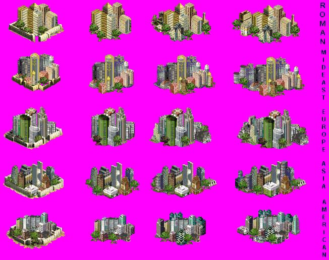 Here's an overview of all the modern city graphics - they look better in the game, but this should suffice.