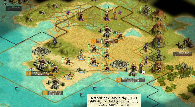 Two of the armies are remaining unpopulated thus far; to build the Heroic Epic, I pinged a longbowman down to one hit point and attacked with a Swiss Merc army. I also just got Metallurgy, so I'll be upgrading my trebuchets to cannons before I continue my offensive.