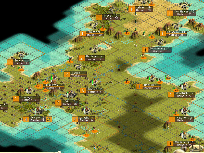2390 BC: Amsterdam completes a settler, which moves to Amsterdam 7-7, and starts another. Rotterdam finishes its granary and starts a settler. It’s going to take some juggling (and rather expensive use of the luxury slider), but an 8-8-6-8 shield pattern should be possible.