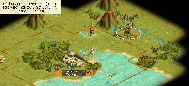 3450 BC: Amsterdam finishes its settler and starts a worker (since two pump-capable cities and one worker is a horrible imbalance). The city can work the game forest for two turns before going back to working the wheat. The settler starts moving “9”.