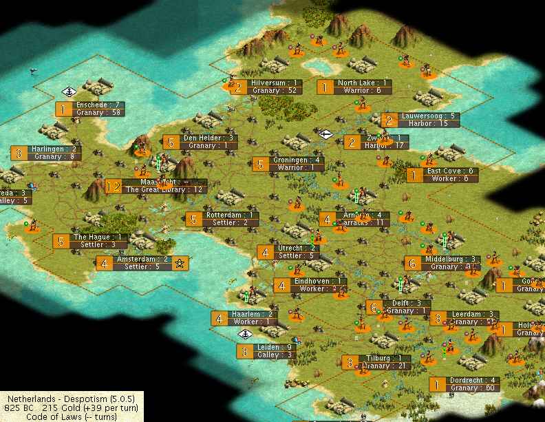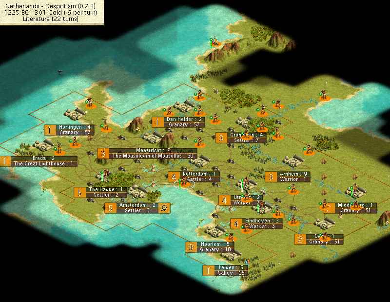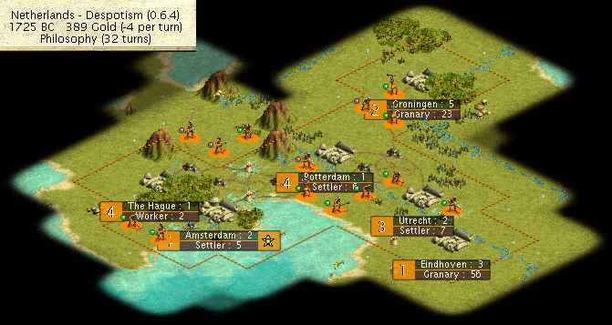 1725 BC: The Hague completes its granary and starts a worker, allowing some shifting of tiles so Amsterdam can start building settlers again. From now on, Amsterdam should be able to function as a full-time 4-turn settler pump.