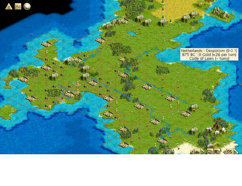 I'm up to 150 AD now, and have just started a 5-turn transition to Republic (having spent a lot of gold researching it myself at maximum in the hope that it will pay for itself in the long term). I now have contact with all the other civs. Egypt is ahead of me in tech, the Zulus are behind me by Republic, and everyone else is lagging significantly behind. I blew some gold on embassies and determined that the Hittites and Arabs are at war; from F11, I suspect that the Hittites are likely in a golden age from it, for better or for worse.