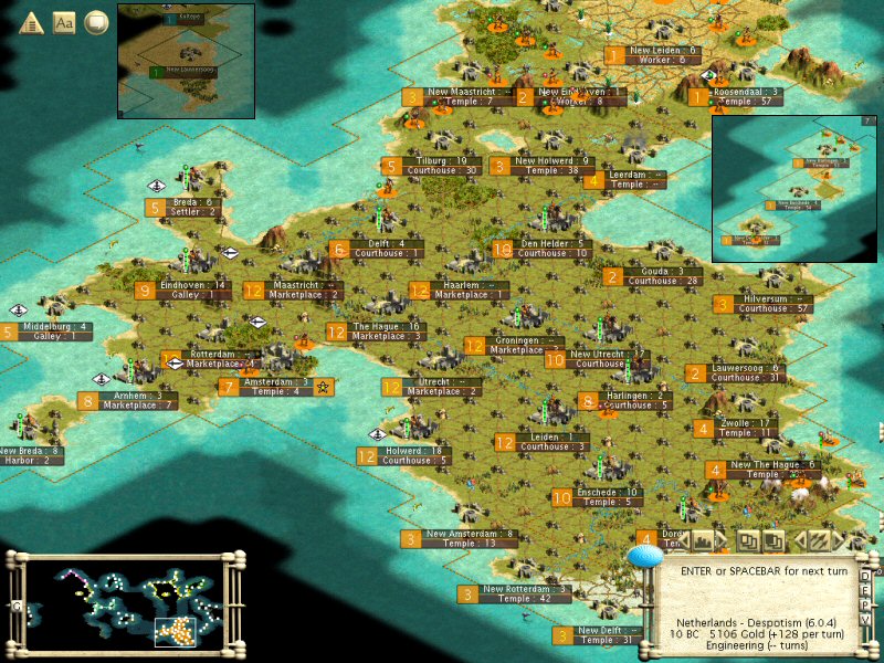 I've just been coasting along at 40% Lux, 60% tax, building up my empire. Have just made it into the Middle Ages, Egypt is about 3 techs ahead (they just started Sistene and have Feudalism), but I will be getting the Republic next turn. Not sure if I want to be a Republic for most of the game, Monarchy tends to be better on Sid, but will switch to it at least for a while if I don't get Monarchy before my Anarchy is up. Getting sick of Despotism and have 5106g saved up so I can rush some badly needed Courthouses in fringe areas.