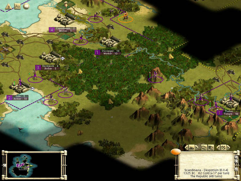 Speaking of deserts, I've also noticed that I've got virtually no deserts within my territory. Doesn't bode too well for saltpeter later in the game. That said, contact has been made with all Civs, and I'm ranked #3 in score. With the Egyptians ranked 1st, followed by the Sumerians. The civs on the other continent seem to be heavily dominated by the Sumerians, who have at least 50% more cities than their nearest rivals, so I have to work fast to beat up on either the Egyptians or the English to catch up. The Egyptians control a reasonable patch of desert just off my SE border, with their capital about 5-6 squares to the north of that desert, so that's an interesting option. Maybe I should start building a FP at the SE edge of my territory in preparation of an assault in that direction.