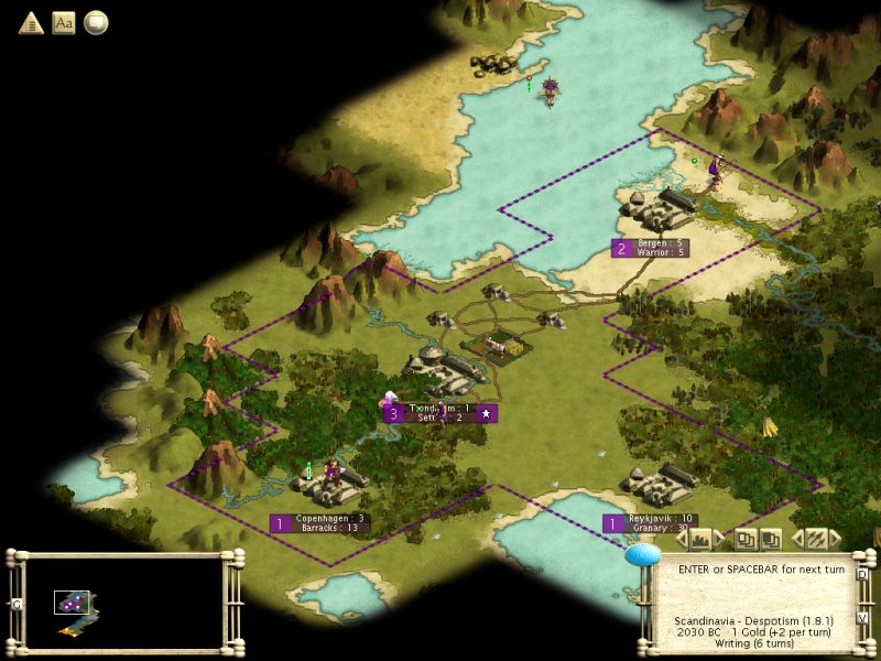 I've also noticed a small lake (about 6x6) in the middle of my continent which is border by all 3 civs. Should be interesting to use that for amphibious assault when Berzerkers arrive, helping me to establish a quick buffer zone, preventing the enemy (whichever I chose to beat up on) from harassing my workers and pillaging my improvements.