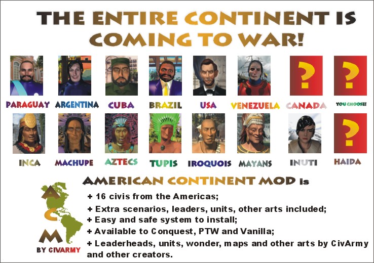This is the American Continent Mod (A.C.M.), these two images show the civis and some units, all them from the Americas (North, Meso and South).